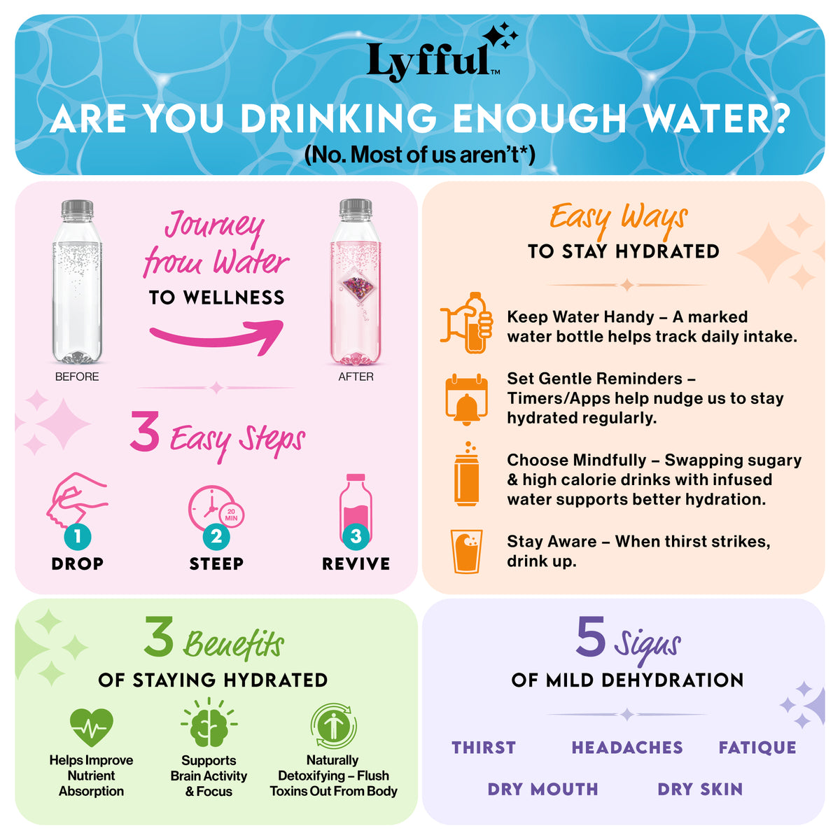 • Drop a LYFFUL wellness pod into your normal water (1-litre recommended)