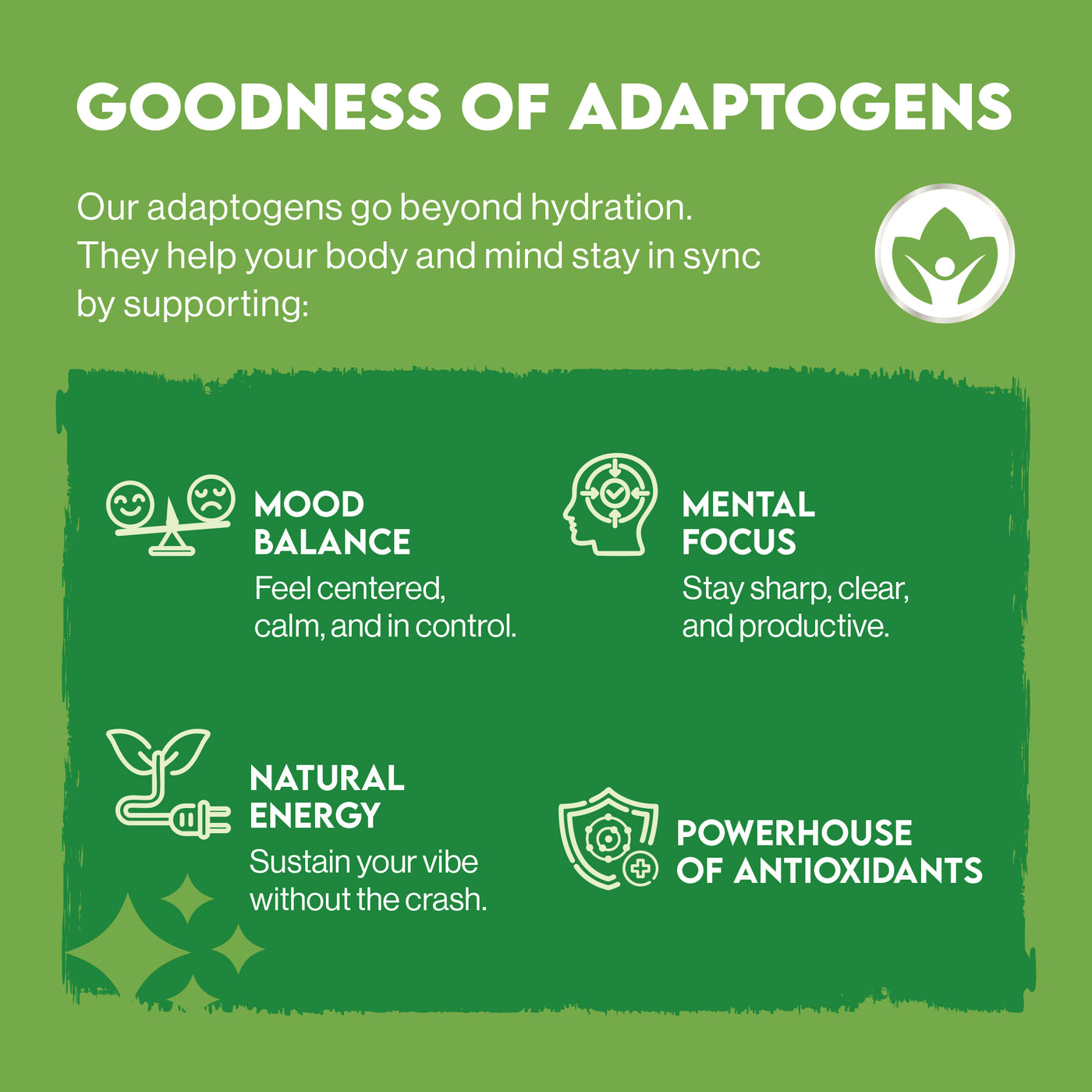 Adaptogens are nature's most powerful herbs that help your body manage stress and maintainbalance. Our adaptogen-infused blends work in harmony with your body,supporting natural energy, calm focus, and mindful hydration throughout yourday.